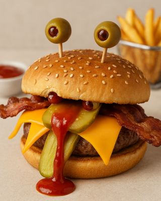 |  Ingrédients : - Pain à burger - Deux tranches de bacon - Un gros cornichon - Deux tranchres de cheddar - Un steak haché - Deux olives  - Deux cure-dents Préparation : - Dans une poêle, faites cuire le steak ainsi que les deux tranches de bacon. - Faites griller les pains à burger (au four ou au grille-pain). - Découpez de fines tranches de cornichon. - Découpez également des triangles dans l'un des côtés de la tranche de cheddar pour créer les dents. - Dans une assiette, déposez la première tranche de pain. - Ajoutez le steak haché puis une première tranche de cornichon pour créer la langue de votre monstre. - Ensuite, ajoutez le cheddar en laissant le côté découpé dépasser du burger. - Ajoutez le bacon et le reste du cornichon. - Versez une à deux cuillères à soupe de la sauce façon Ketchup. - Déposez la deuxième tranche de pain en appuyant légèrement sur le burger pour que la sauce façon Ketchup coule. - Enfin, plantez deux cure-dents sur le pain du dessus et ajoutez une olive sur chacun d'eux. Et voilà ! Dépêchez-vous de le manger avant que ça ne soit lui qui vous mange ! Partagez vos recettes avec #lacuisineprovencale |