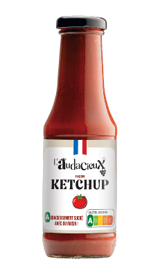 L'Audacieux façon Ketchup est élaboré avec des tomates mûries sous le soleil de Provence et sucrée avec du concentré de raisin issu des récoltes des vignerons de la cave du Gravillas à Sablet (84). Sans additifs artificiels et affichant un Nutriscore A, l'Audacieux sublime vos viandes, frites et féculents.